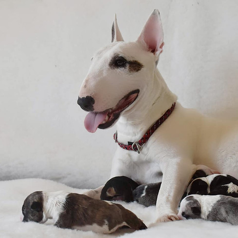 Eigentlich einen Tag zu früh, aber Coco wollte uns bestimmt zeigen was die ganzen Wochen in ihrem Bauch so los war. Morgens früh, pünktlich nach dem Frühstück ging es dann ohne Vorankündigung los. Ganze sechs Stunden später lagen bei uns in der Wurfkiste die fünf bezaubernsten Welpen der Welt. Coco hat uns 3 Rüden und 2 Hündinnen geschenkt. Alles was an Farben (rot, Tri Colour, gestromt, schwarz gestromt)aus dieser Verpaarung möglich ist, liegt nun piepsend und gurgelnt in unserer Wurfkiste. Coco hat das so toll gemacht und wir sind mega stolz auf die Maus.